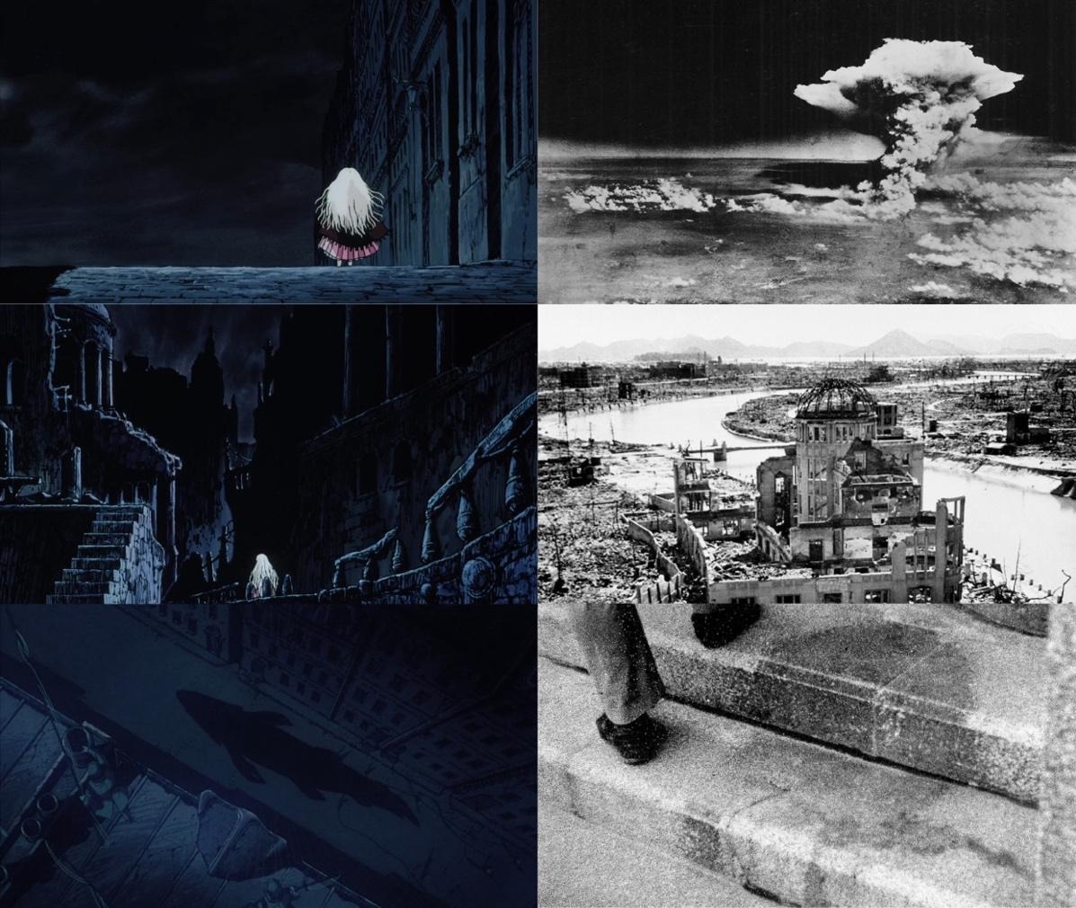 The comparison is at once poignant as it is relevant: where Adorno was reacting to the devastating crimes against humanity that had been committed during the Holocaust, Cole highlights the catastrophic consequences of the atomic bomb in Hiroshima—a disaster that the West had celebrated for putting an end to the Second World War. In Cole’s view, the world of Angel’s Egg is identifiable as that of a nuclear holocaust. The perpetual darkness of the skies is attributed to nuclear winter; the cavernous, sparse, and dilapidated ruins mirror the bones of Hiroshima and Nagasaki; the “shadows hunted by ghosts” are reminiscent of the flash burn effect (see fig. 2).